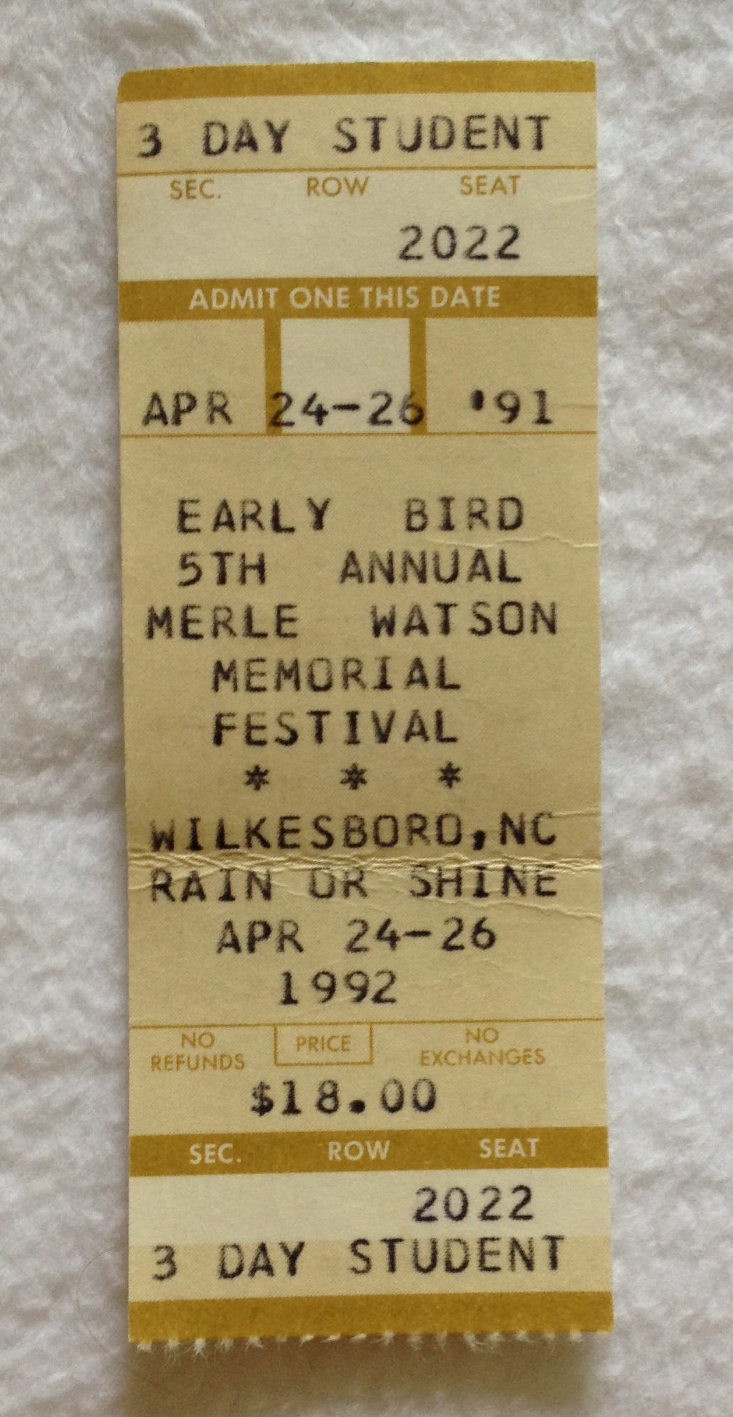 One late winter day, a letter came from a college friend, written on the back of a flyer for the Merle Watson Memorial Festival, happening in Wilkesboro, just an hour up the road. Amid the sprawling lineup, he had circled one name: Jerry Douglas. Three-day student tickets were $18, so I xeroxed my ID and sent a check for $36, and on the last weekend in April 1992, my high school buddy Andrew and I headed to Wilkesboro.
